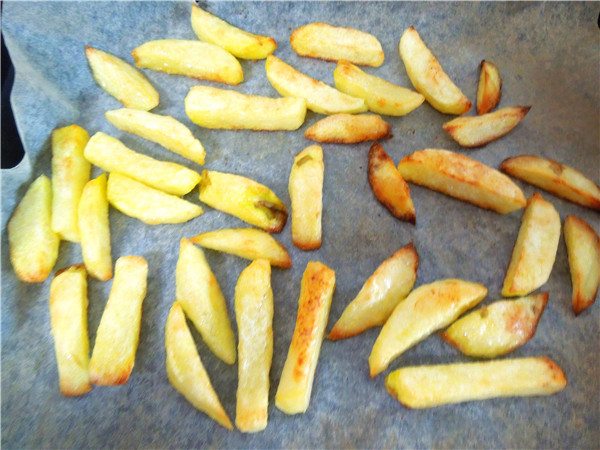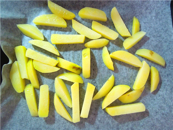 把拌好的土豆条平铺在烤盘上,230度上下火烤20分钟即可。中间也可以翻个面。